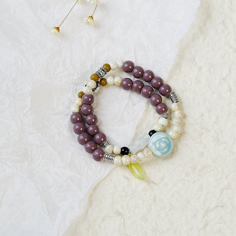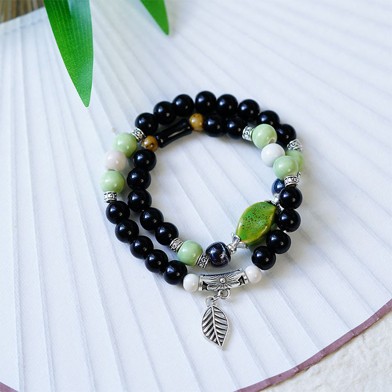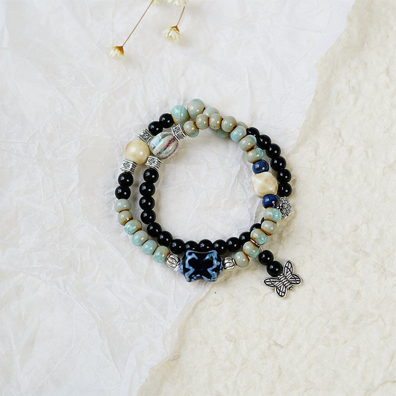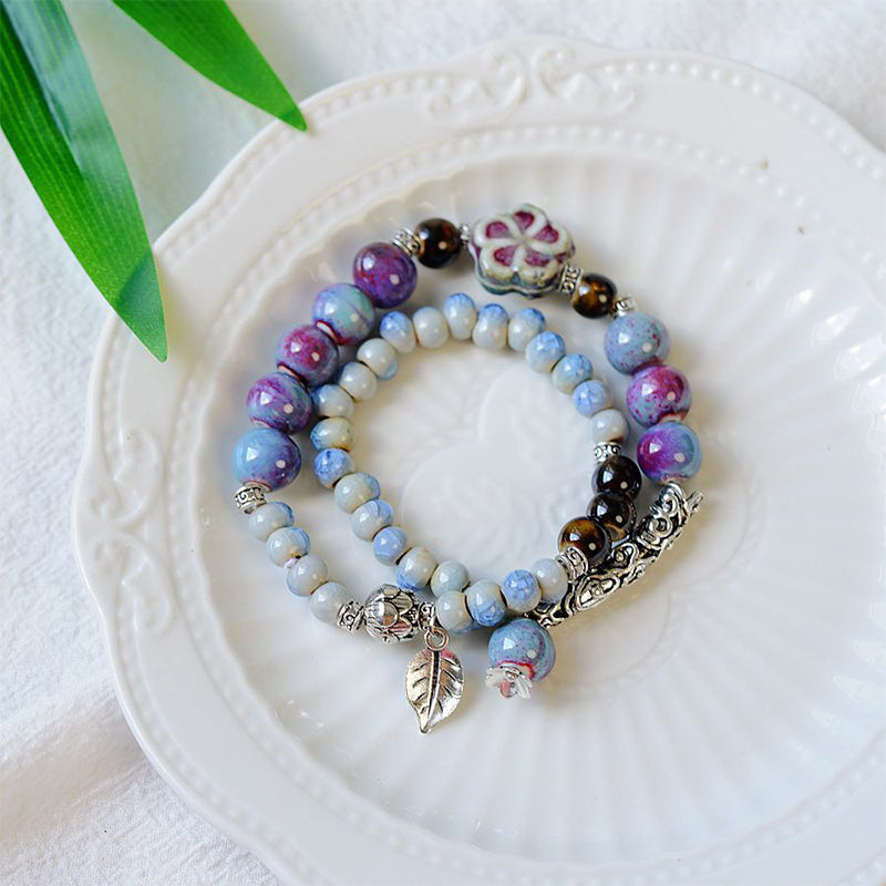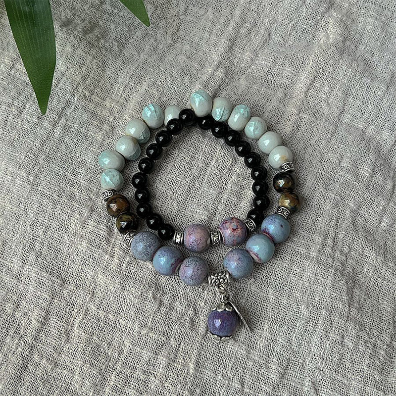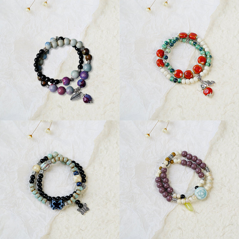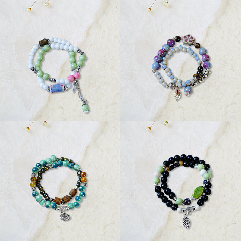 VOLLEDIGE PARELARRANGEMENT - De keramische kralen zijn zorgvuldig gerangschikt om een gebalanceerd en visueel aantrekkelijk ontwerp te creëren. Elke kraal is geselecteerd op zijn unieke patroon en kleur, waardoor de armband opvalt als een kunstwerk.
