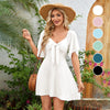 Geniet van tijdloze elegantie met onze Elegante Diepe V-Hals Strik Mini Jurk, ontworpen om de aandacht te trekken en verfijning uit te stralen.