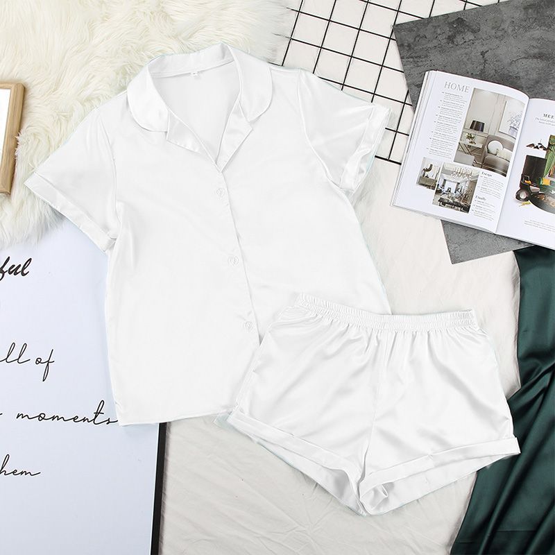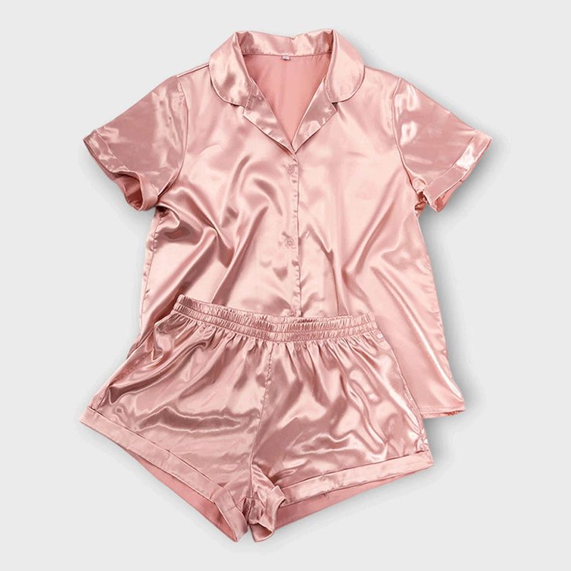 Imitatiezijden pyjama voor dames. Lichtgewicht short en een blouse met knoopsluiting in effen kleur.