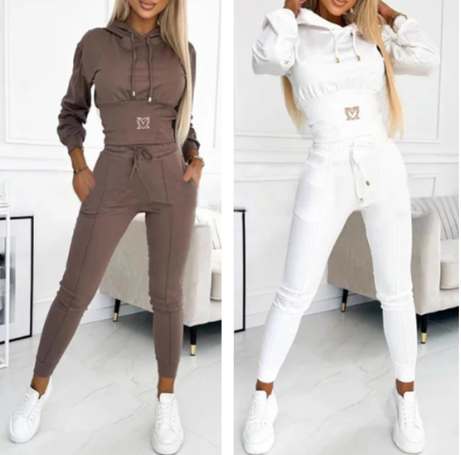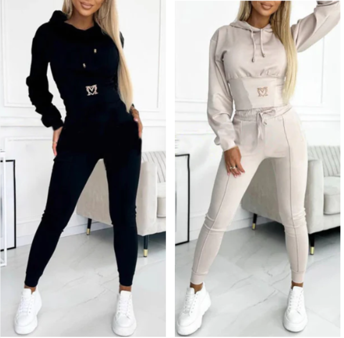 STIJLVOL EN COMFORTABEL ONTWERP: Deze tweedelige set combineert mode en functionaliteit, met een slim-fit hoodie en high-waist joggers. Het effen kleurontwerp met een subtiel geborduurd logo voegt een vleugje elegantie toe voor zowel casual als actieve kleding.