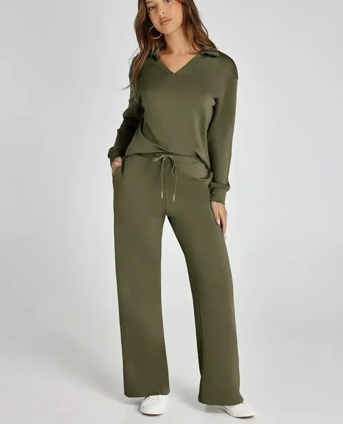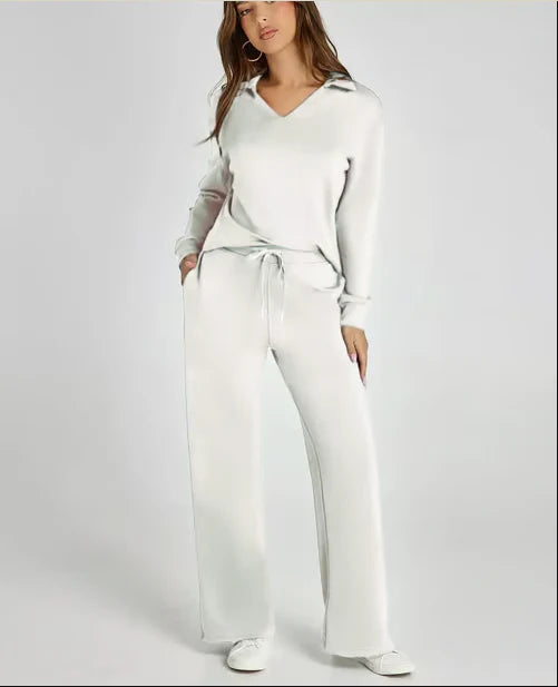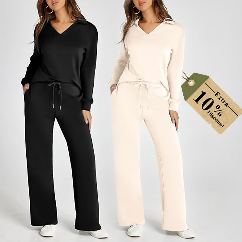 De sweatsets zijn voorzien van een sportieve kraag, V-hals en hoog-laag zoom. De broek heeft een hoge taille en een trekkoord. Het trekkoord zorgt voor een pasvorm op maat en een losse pasvorm die de wijde pijpen laat zien. De hoog-laag zoom biedt extra bedekking aan de achterkant en de stretchstof is 4-way stretch voor gemakkelijke bewegingsvrijheid.