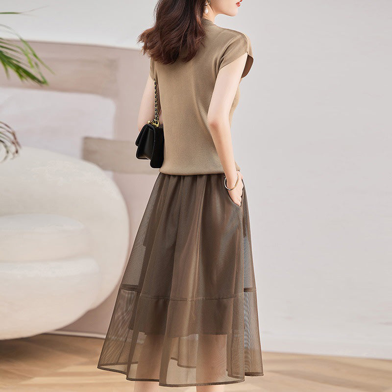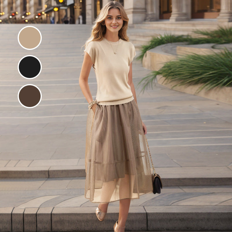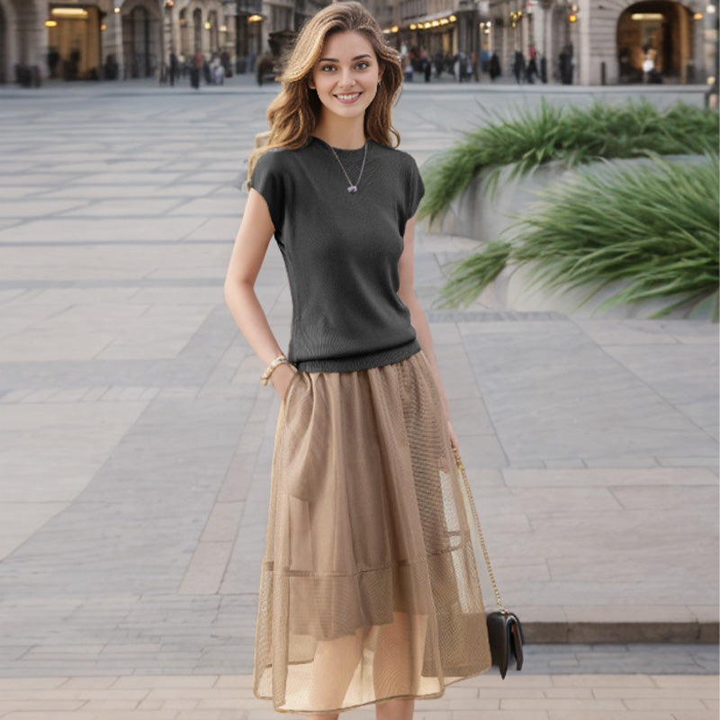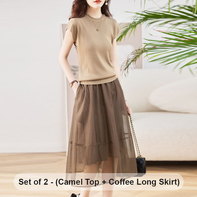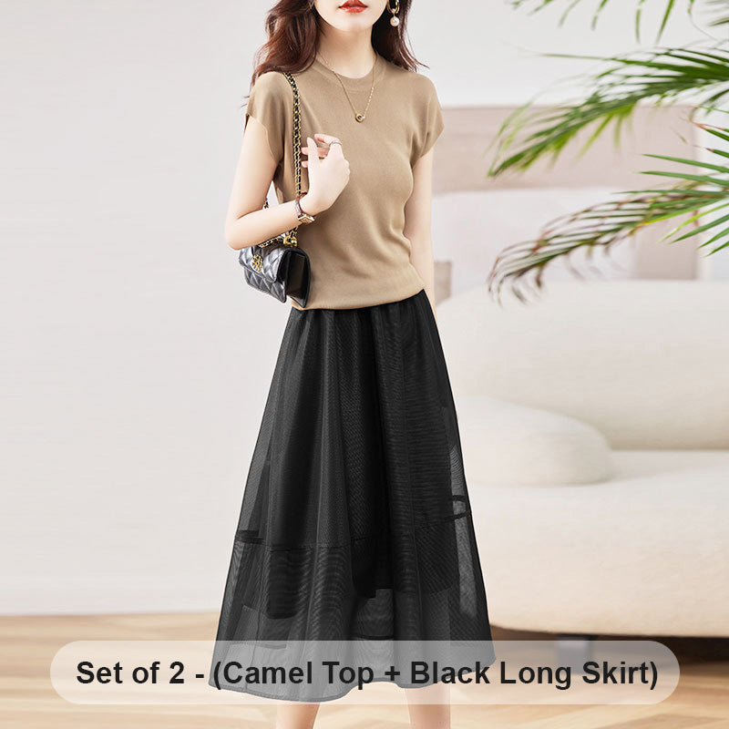 Geef je stijl een upgrade met deze elegante tweedelige set. Het bovenstuk is comfortabel en ademend. De lange rok heeft een dubbellagig ontwerp met een niet-transparante voering voor extra kledingzekerheid, terwijl de buitenste laag gemaakt is van doorzichtige stof.