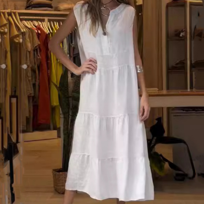 Het gelaagde ontwerp voegt een vleugje verfijning toe, terwijl de v-hals en mouwloze snit zorgen voor een flatterende en comfortabele pasvorm. Gemaakt met hoogwaardige materialen en oog voor detail, is deze jurk een must-have toevoeging aan je zomergarderobe. Stap zelfverzekerd en stijlvol de deur uit met onze Vrouwen V-hals Knoopmouwloze Gelaagde Lange Jurk.