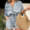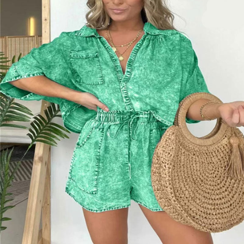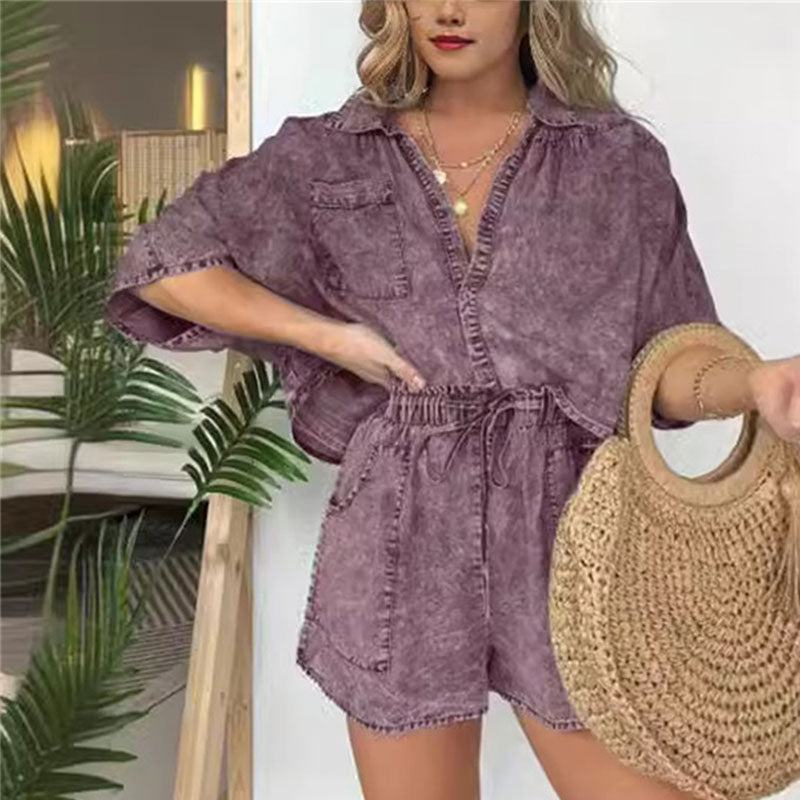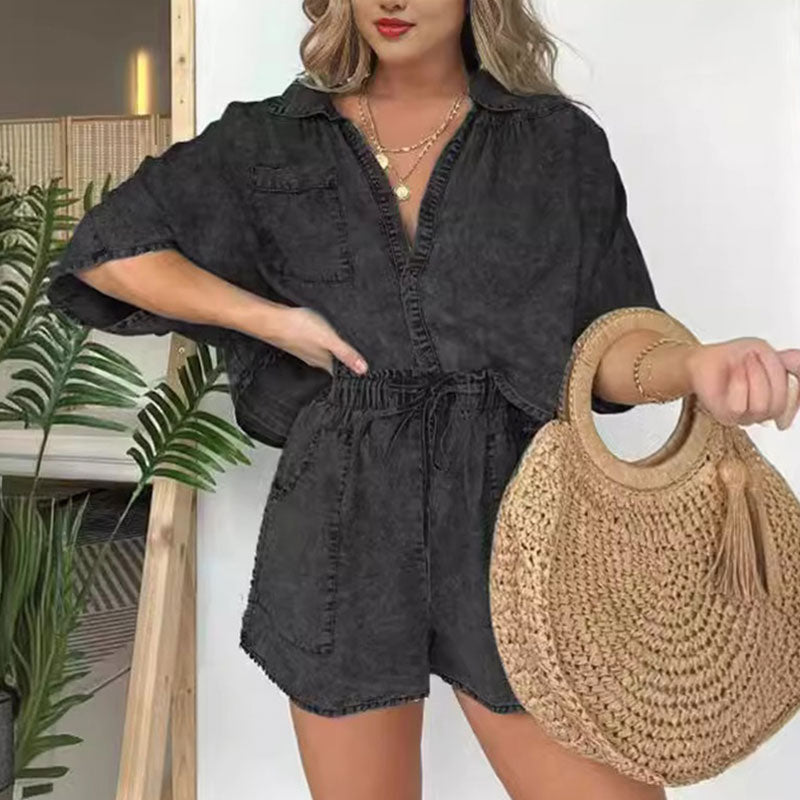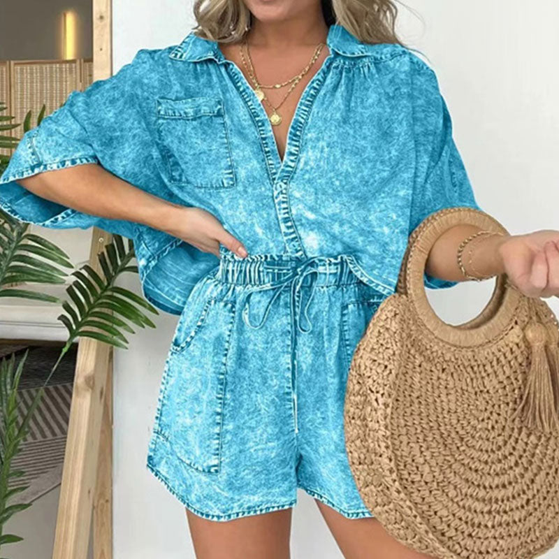Deze denimset met cropped overhemd en short is moeiteloos stijlvol en veelzijdig, perfect voor elke gelegenheid.